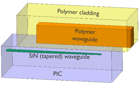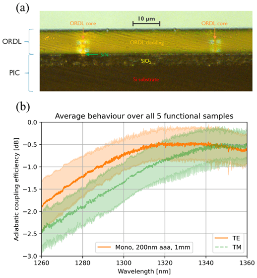 IMEC developed an efficient PIC-to-ORDL adiabatic coupling approach. The figure shows the concept, a cross-section of the realized structures and sub -1dB coupling efficiency in O band for TE and TM polarization. (ORDL: optical redistribution layer). More info.