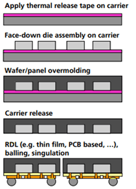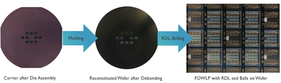 Fraunhofer IZM developed Fan-Out Wafer-Level Packaging (FOWLP) technology that allows co-packaging optical and electrical ICs on wafer level. The figure shows the process flow and results of a mock-up demonstration using dummy optical/electrical ICs.