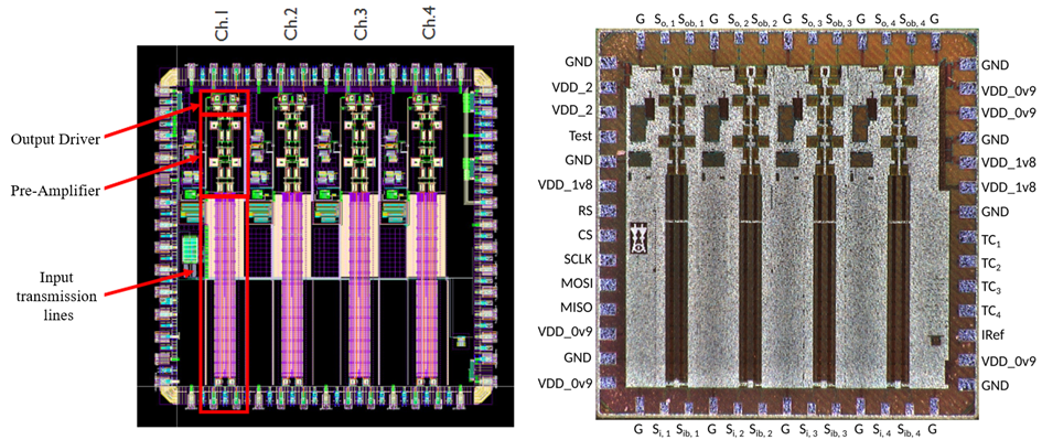 IMEC developed a 32-channel (4 spatial channels, 8 wavelengths) transmitter and receiver PIC and matching high-speed modulator driver chips (4 Ch) and transimpedance amplifier chips (4 Ch).